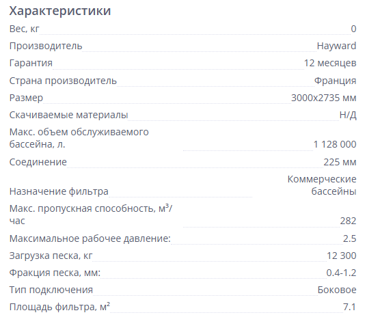Клапан режимов и трубная обвязка в комплект не входят. Производительность: 190 м³/час. Тип подключения: боковое. Соединение: 200мм. Загрузка песка: 5925 кг. Клапан режимов и трубная обвязка в комплект не входят.