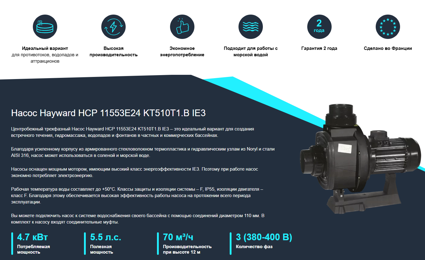 Насос Hayward HCP11553E24 KT510T1.B IE3 (380 В, 70 м3/ч, 5.5 HP)