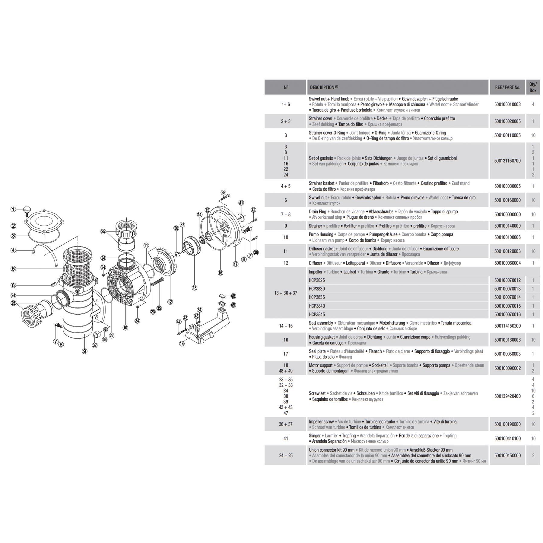 Насос HCP38251E оснащен префильтром, крышка которого крепиться при помощи четырех болтов. Крышка выполнена из прозрачного, высокопрочного полимера. Болты – нержавейка, с пластиковыми колпаками и латунным основанием. Открывается крышка легко, без специального инструмента, что позволит быстро выполнять чистку префильтра.
