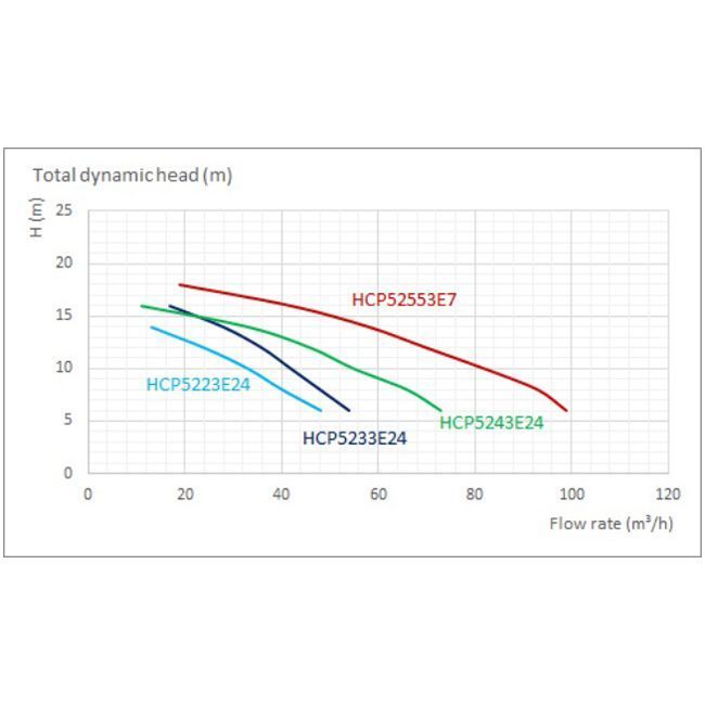 Производительность HCP5243E24 составляет 66 м.куб/ч при высоте водного столба 10 метров. Электромотор – TEFC IE3: двигатель полностью закрыт и оснащен вентилятором для самоохлаждения, что позволит избежать перегрева мотора при длительных интенсивных нагрузках. Отвечает стандарту энергоэффективности IE3. Мощность электромотора – 3 кВт/4,0 л.с., рассчитан на трехфазное подключение к электросети – 380В. Частота оборотов двигателя составляет 2850 об/мин. Класс изоляции данной модели – F, защита – IP55.