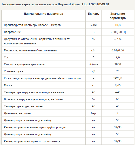 Самовсасывающий циркуляционный насос Hayward Power-Flo II SP8105XE81 (10,8 м3/ч, 220В) - предназначен для перекачивания воды в системах плавательных бассейнов. Чаще всего используется в качестве прокачивающего насоса фильтровальной установки бассейна. Hayward Power-Flo II – это малошумный одноступенчатый насос с горизонтальным расположением вала и электрическим приводом с автоматической температурной защитой и крыльчаткой Noryl ® с медными вставками. Оснащен фильтром грубой отчистки объёмом 1100 cm3. Для нормальной работы насоса необходим постоянный приток перекачиваемой воды. Можно использовать в соленой воде содержащей не более 5 граммов соли на 1 литр воды.
