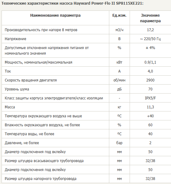 Самовсасывающий циркуляционный насос Hayward Power-Flo II SP8115XE221 (17,2 м3/ч, 220В) - предназначен для перекачивания воды в системах плавательных бассейнов. Чаще всего используется в качестве прокачивающего насоса фильтровальной установки бассейна. Hayward Power-Flo II – это малошумный одноступенчатый насос с горизонтальным расположением вала и электрическим приводом с автоматической температурной защитой и крыльчаткой Noryl ® с медными вставками. Оснащен фильтром грубой отчистки объёмом 1100 cm3. Для нормальной работы насоса необходим постоянный приток перекачиваемой воды. Можно использовать в соленой воде содержащей не более 5 граммов соли на 1 литр воды.